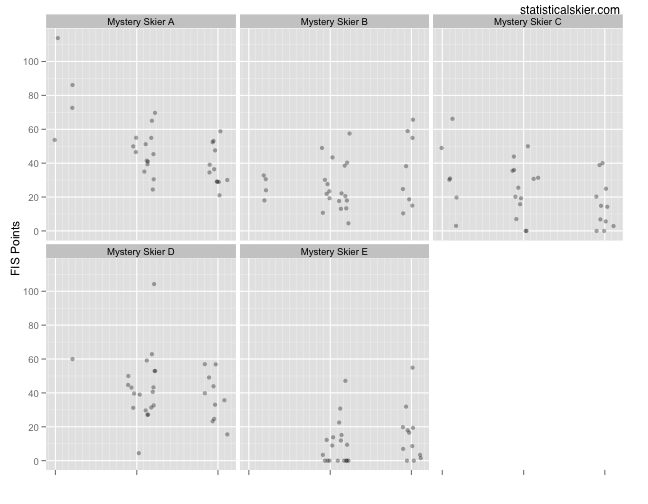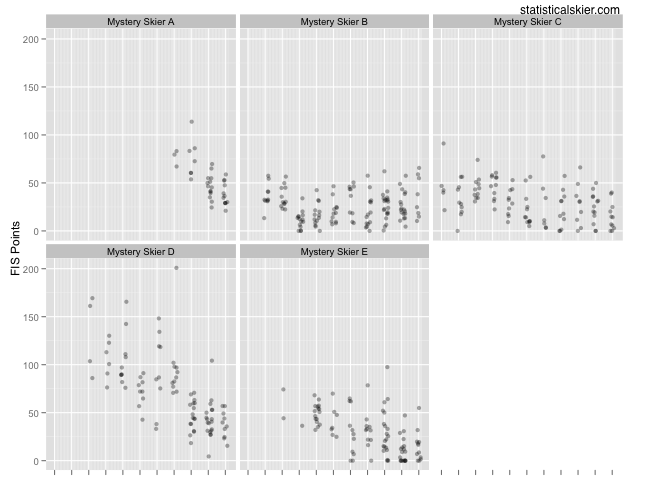 Another guessing game, this one based on a misunderstanding of a previous one. This time, I’ve graphed FIS points vs. date for five skiers up to an Olympic race where they will all race against each other and finish in the top five. Your job is to identify the medalists and for bonus points the order of finish for all five.