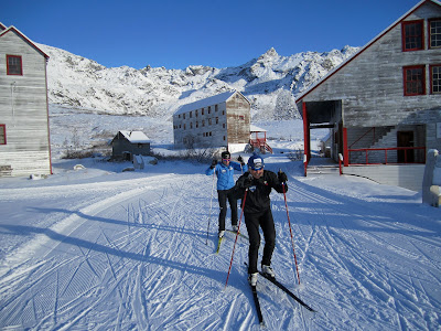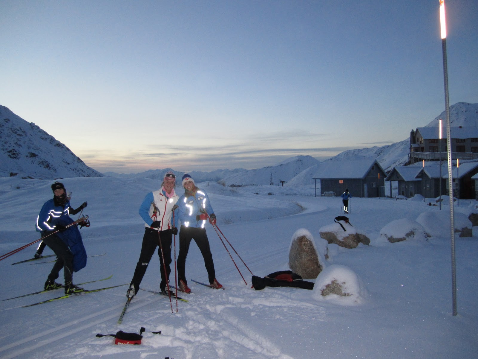 Hatcher’s this morning was our first time on snow since our week of skiing on Eagle Glacier in August. I felt awkward for approximately two minutes before the roller ski/snow ski adjustment set in. I suppose that is one of the many benefits of summer glacier skiing…… Here Sadie and Greta pose for an early morning shot as Jack (left) skis into the picture.
