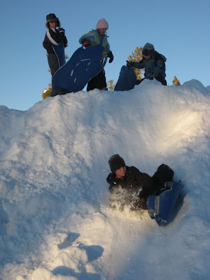 My favorite is playing outside. The school plows up the playground to form perfect 20′ sledding hills.