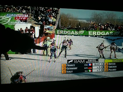 Just got this photo from my aunt in Switzerland where my family was watching the race on Eurosport. That’s my cousin Aleksander’s hand pointing to me when Sara tagged off.