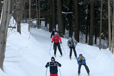 This morning we went for an adventure ski right here in the Mad River Valley. We started at The Battleground on the Catamount Trail. We climbed for over an hour up a snowshoe trail, then met up with the a groomed VAST Trail. The terrain on the VAST trail was very hilly, and very steep! It was an adventure with a big group of skiers, 2 golden retrievers, and plenty of powder!