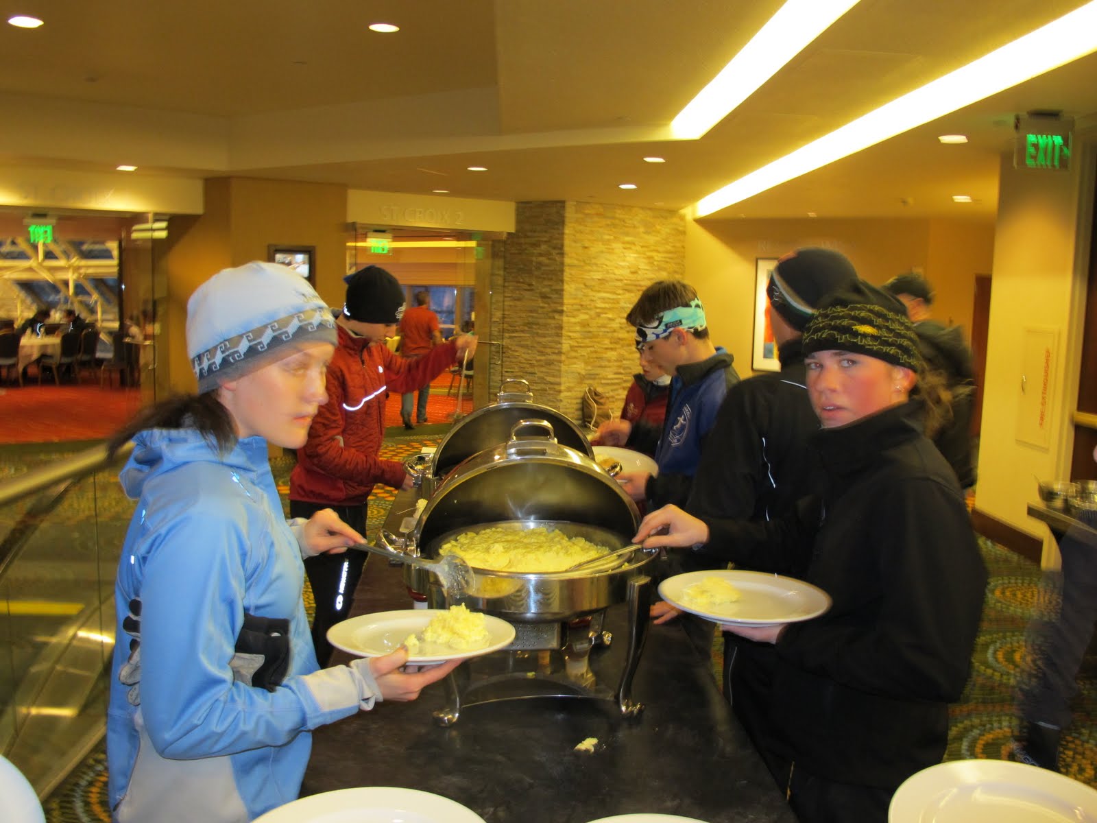 After the morning ski, everyone hops the bus for a ride back to the hotel. This afternoon we are planning a shopping trip in the city. The coaches are looking for healthy snack food, the kids will no doubt be looking at everything. Supposedly there are 50 miles of walkways in the city so maybe we will go exploring. We are also looking forward to the rest of the team arriving. And to Jack, who broke his foot 2 days ago and couldn’t make the trip, “hang in there, heal quickly and keep smiling”.