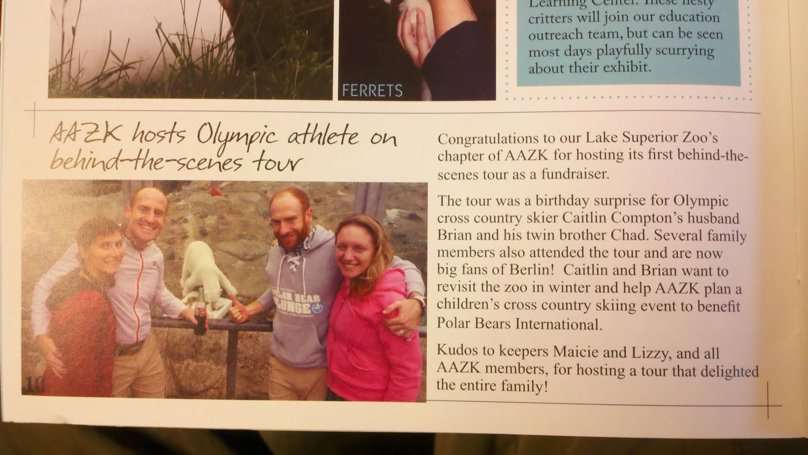 The tour was a birthday surprise for Olympic cross country skier Caitlin Compton’s husband Brian and his twin brother Chad. Several family members also attended the tour and are now big fans of Berlin. Caitlin and Brian want to revisit the zoo in winter and help AAZK plan a children’s cross country skiing event to benefit Polar Bears International”