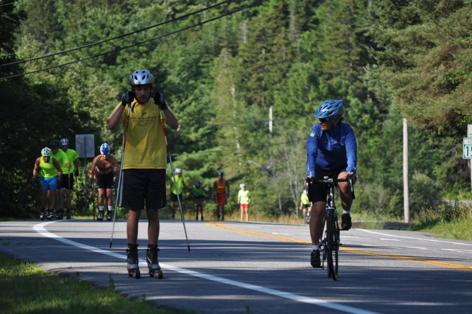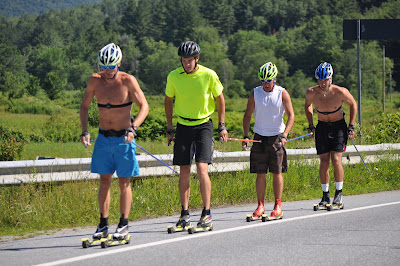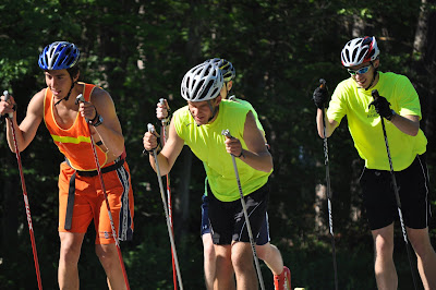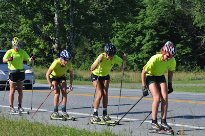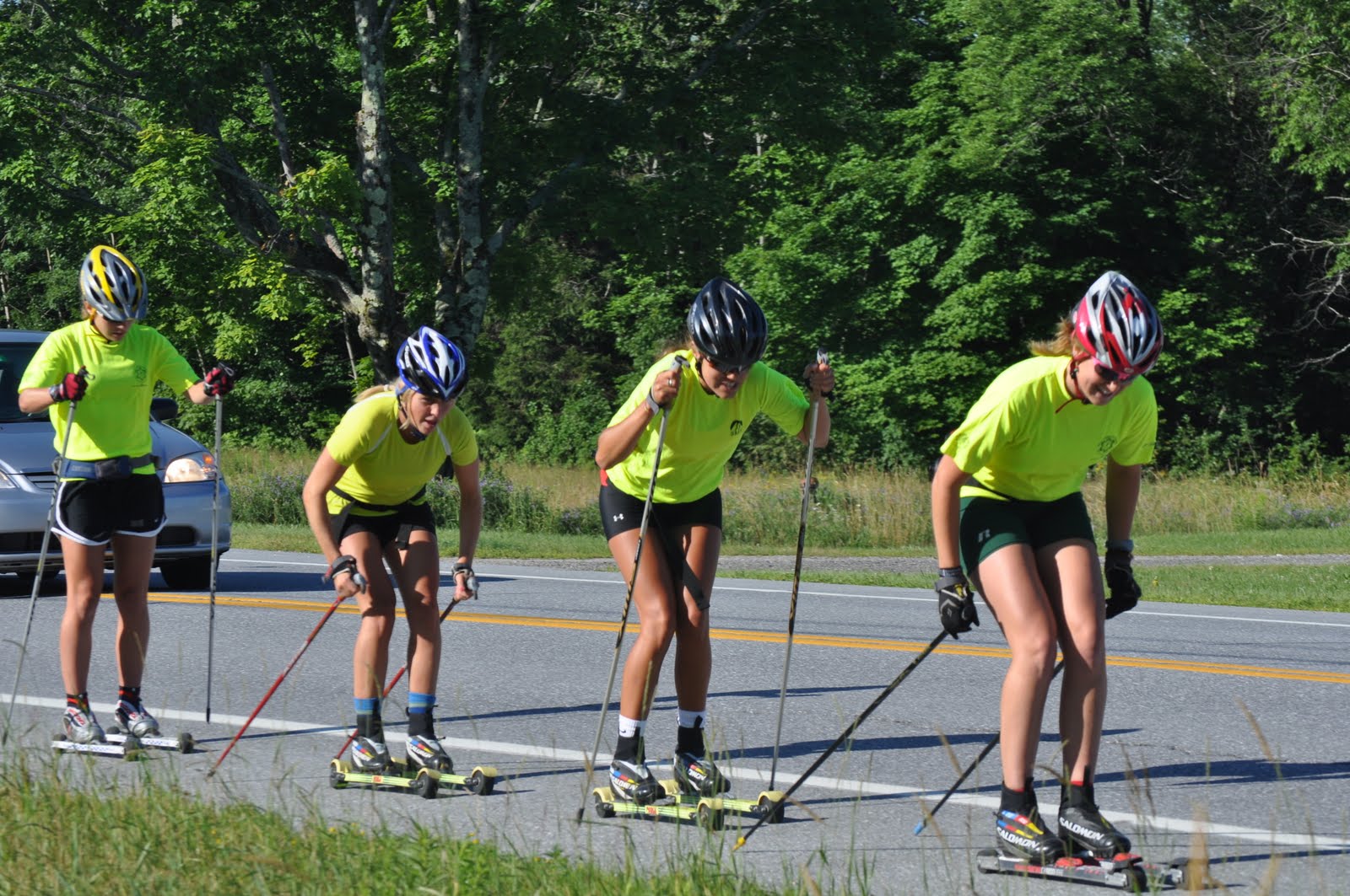 What a perfect day for a double pole distance workout (64, blue skies and low humidity). Here the group gets workout instructions before they head out. Todays workout was pretty simple…2 hrs of d-pole, with some d-pole kick, s-pole and a little speed, followed by some striding technique drills.