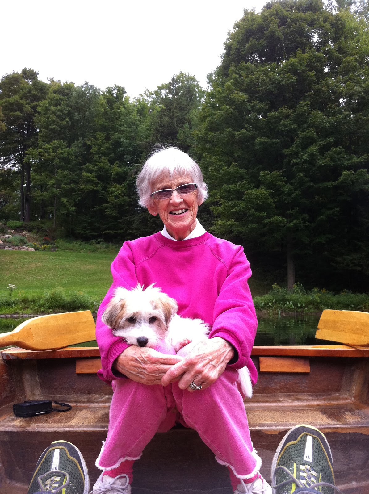 Rowing with my grandmother and my moms new dog “Pebble” back home in Caledon.