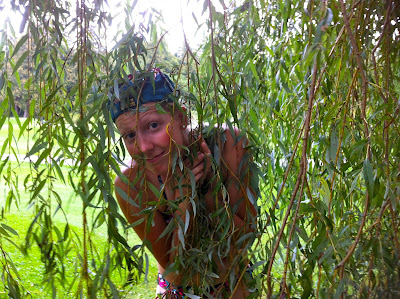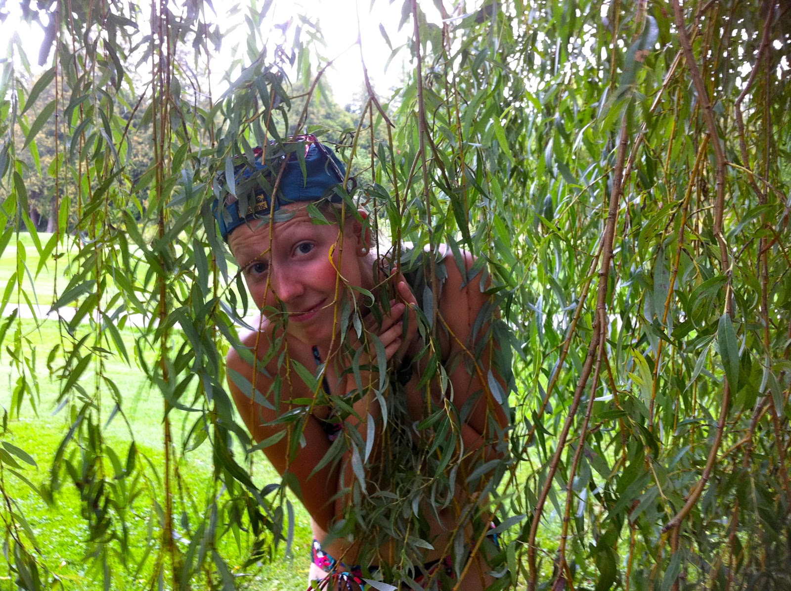 Hiding from the rain under a huge willow tree.