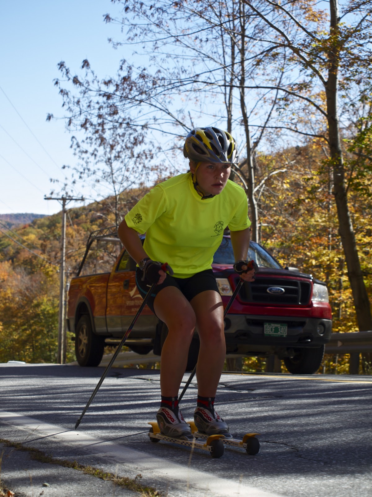 Heidi getting in a good forward position, falling on those poles.