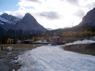 Here are a few pics of the Canmore Nordic Centre pushing out Frozen Thunder over the last few days. Pretty exciting stuff! The CNC pushed a whole bunch of snow into a hole last spring and covered it with sawdust. And when I say a whole bunch, I mean a gigantic amount of snow! The pile of snow dubbed “Frozen Thunder” has been waiting out the summer and was uncovered earlier this week. The CNC has been working like crazy to get the snow out onto the trails. Tomorrow is the grand opening, with a loop around 2km in length (three meters wide with a 50cm base!!). For October 15th, that’s amazing! For most people, skiing is still two months away, but for the lucky residents of the Bow Valley, it is mere minutes away!