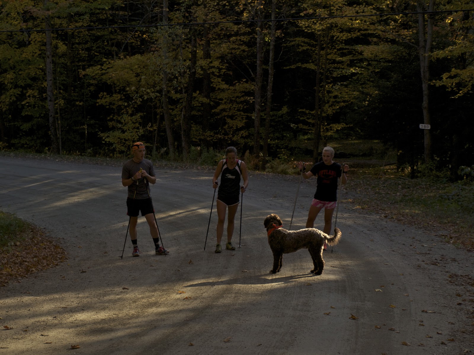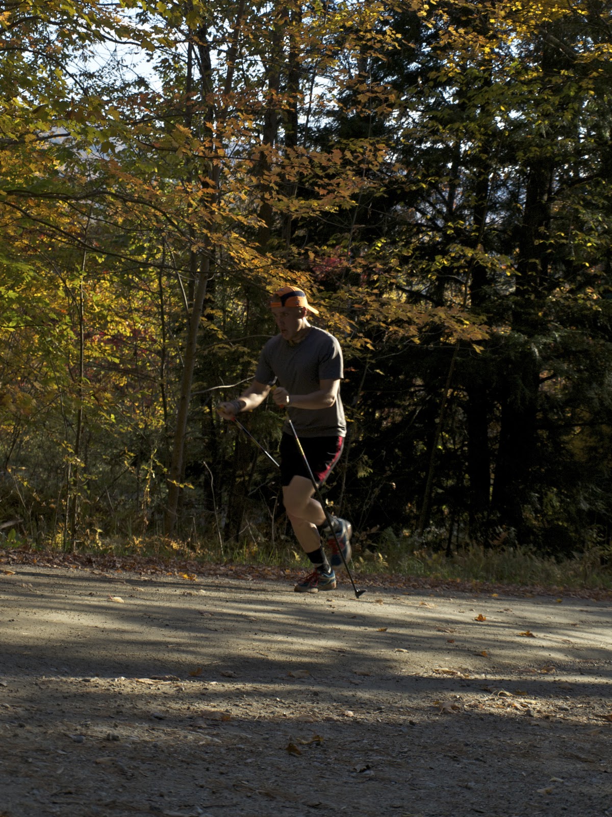 After an incredible Indian Summer weekend, the good weather persisted for ski imitation and speed bounding yesterday. We started out with some drills, thinking about setting kick wax, keeping the hips forward, and swinging our arms and legs to conserve momentum.
