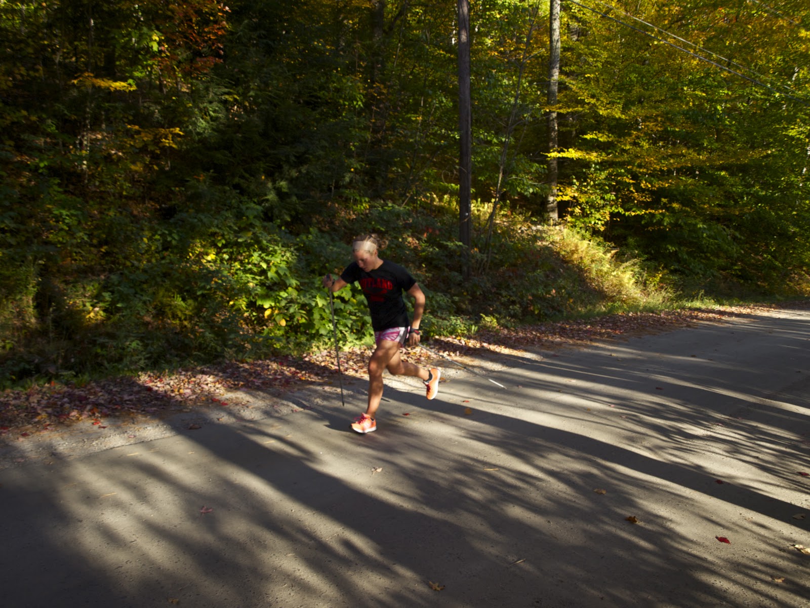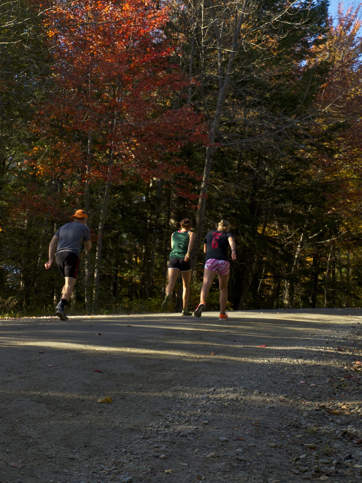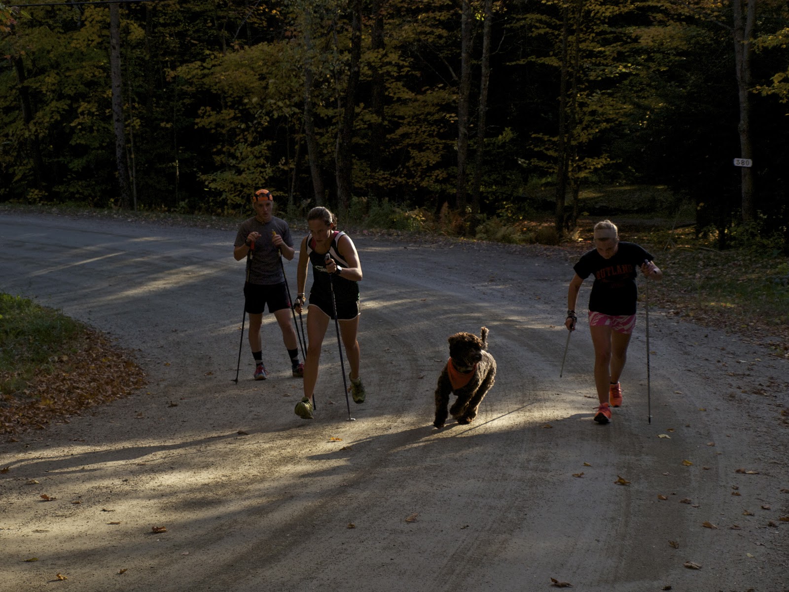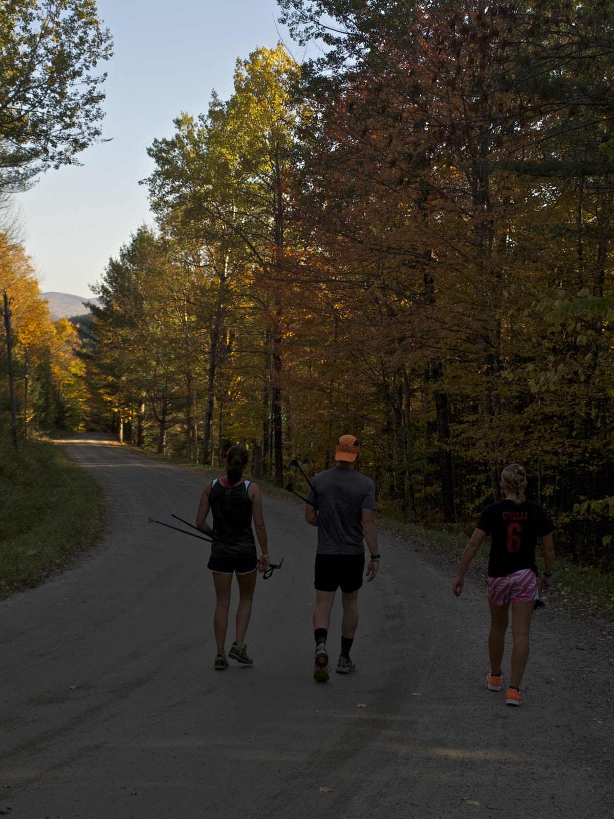 After an incredible Indian Summer weekend, the good weather persisted for ski imitation and speed bounding yesterday. We started out with some drills, thinking about setting kick wax, keeping the hips forward, and swinging our arms and legs to conserve momentum.