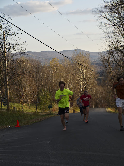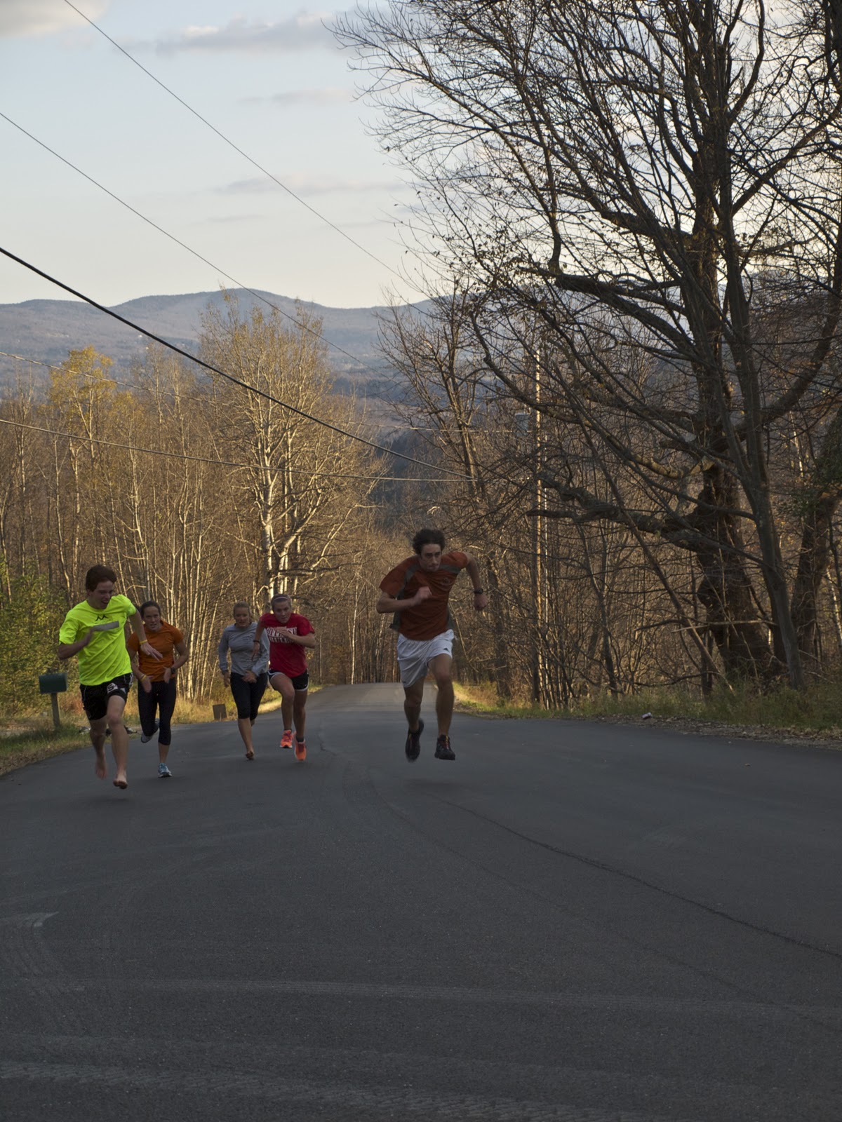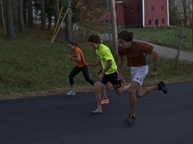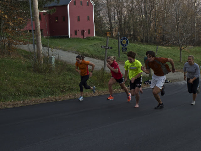 Today we stepped out the backdoor onto some fresh pavement to do max speed/power work on foot and on roller skis. After warming up on the classic boards, we launched into the workout, designed to develop fast, explosive impulses.