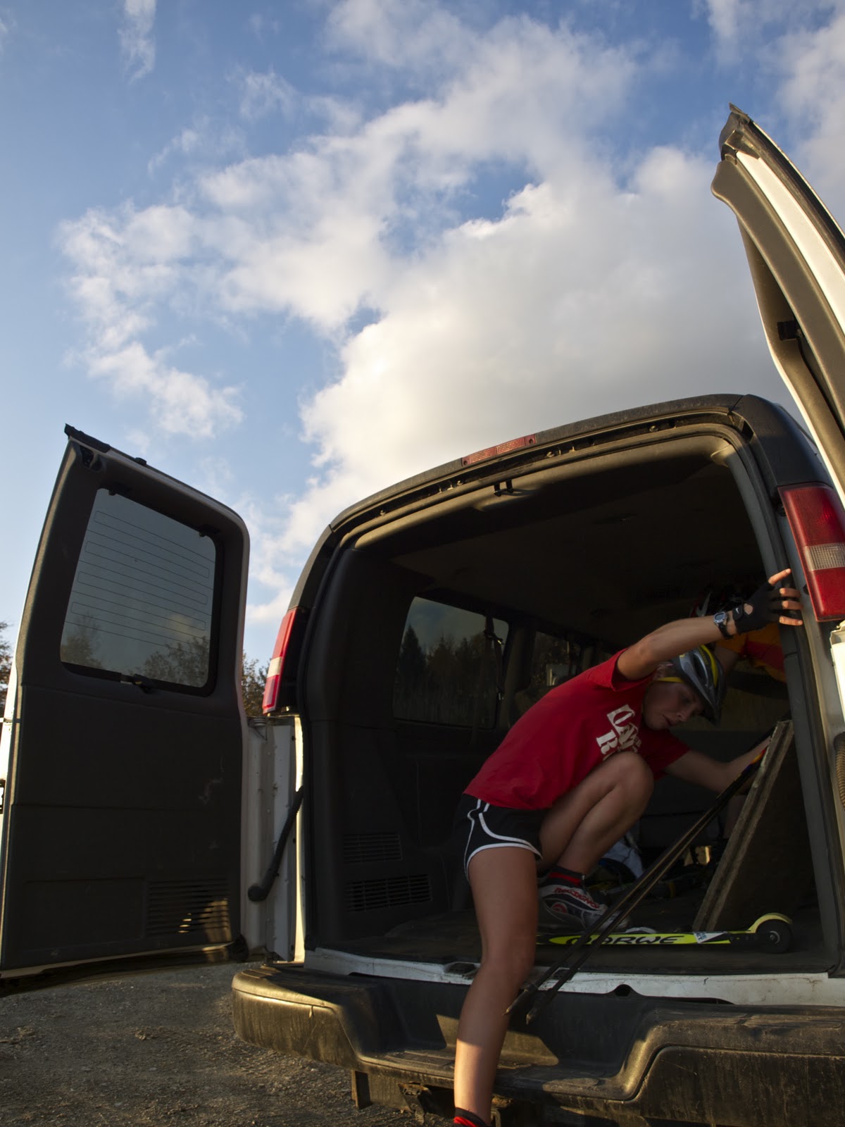 After the running, we strapped on the skis, rolled up the hill easily, then returned (with skis still on!) to the start line in the van. Three more sets of max speeds and we were done. A solid workout all around.