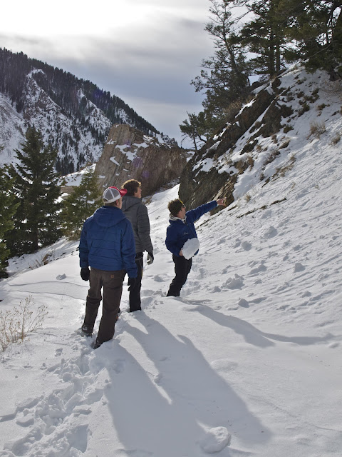 Always time for a few lessons of about the snow — checking out roller balls of snow caused from the suns intense warming of the snow. Coach Beckwith has a large one in his hands and and there are many more in front of the group.