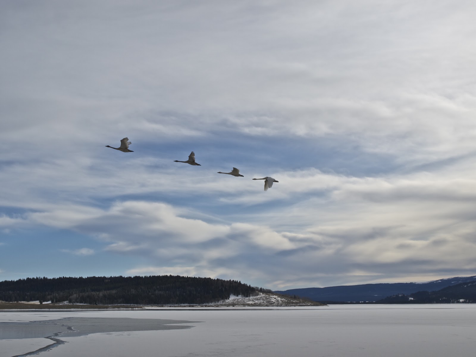 Enough of the non-living science! Animal hunting or spotting is a fun game we’ve been playing as a team on drives. We were greeted by a surreal scene on Hebgen Lake, with a small flock of Trumpeter Swans sitting on mirror-like ice and then flying along us on the road. Evan was able to catch some neat shots.