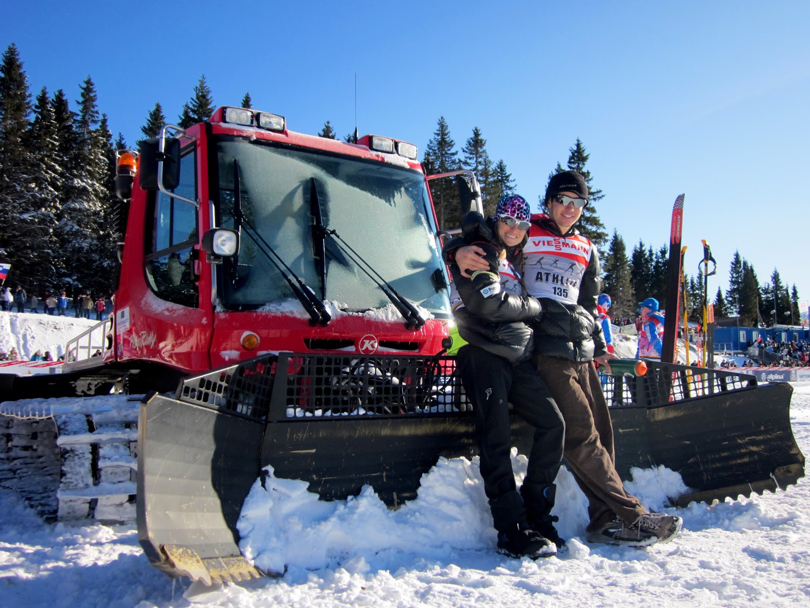 Liz and the Hoff chillin on the Pisten Bully, Rogla Stadium