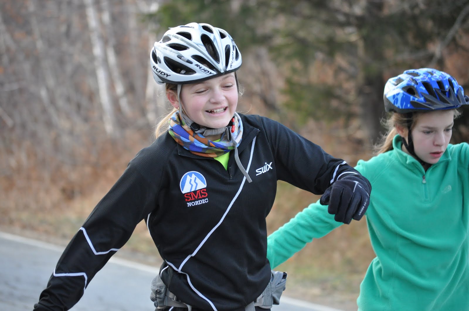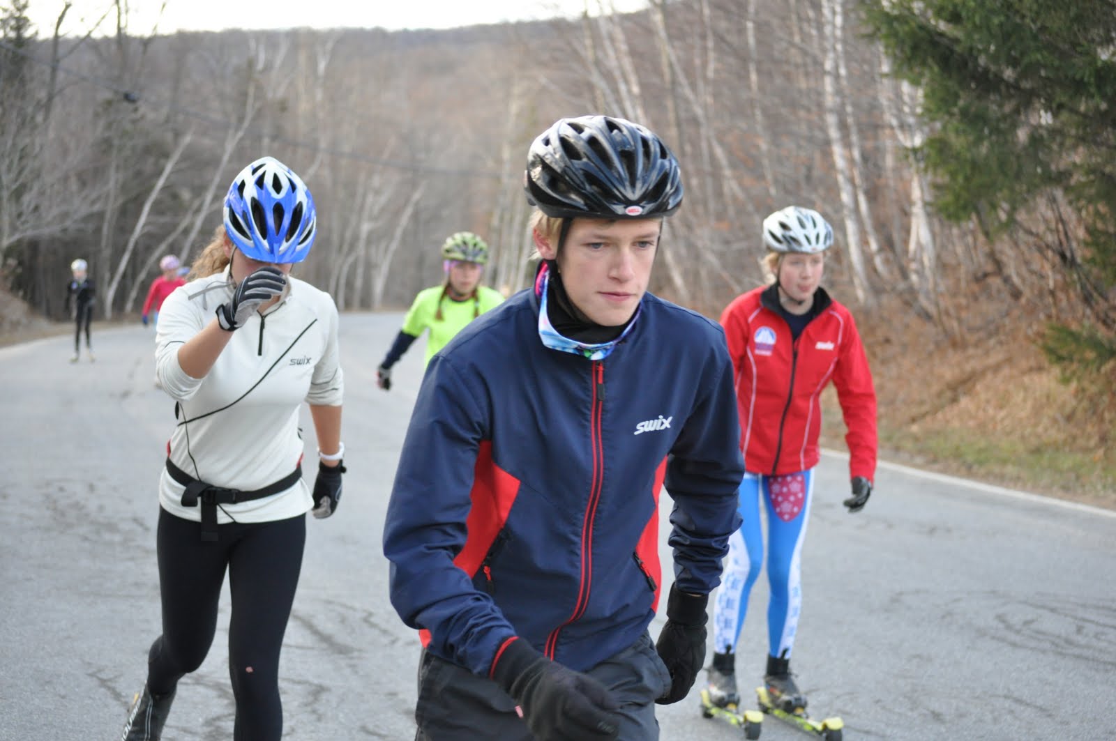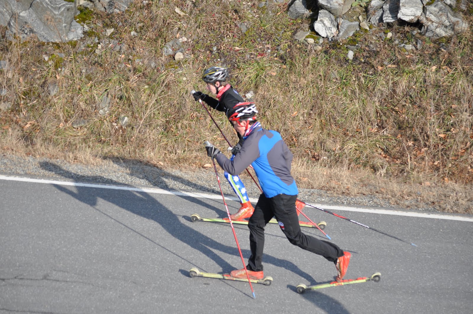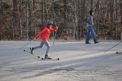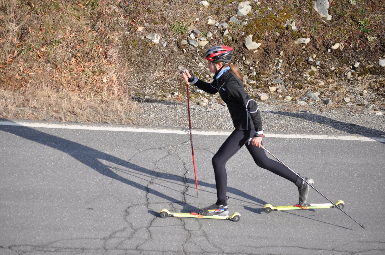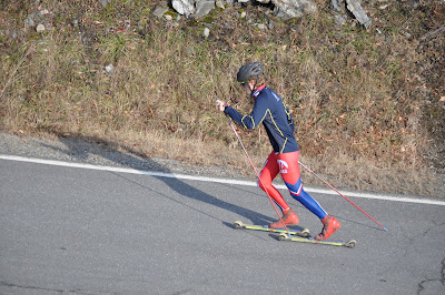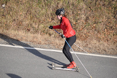 The running drill uphill – run on your rollerskis, run with poles on your rollerskis…. then flow right into a snappy stride.
