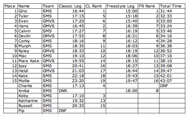 We did a 5k + 5k continuous pursuit with GMVS on Wednesday morning. Classic first, skate second. It had rained two days prior and then snowed the night before making for variable conditions – powder here, ice there. Fun conditions to practice racing on! Everyone skied well and put together a great effort. J2/J3s & Charlie only did the classic leg, Anika only did the skate leg. Several people were pretty tired from the week and opted out of the TT and got in a nice distance ski instead. Congratulations to Gino & Mary Kate Cirelli (GMVS) for whipping around the 5K loop twice and taking the boy’s and girl’s wins! Thanks to Justin & Evan for bringing their crew over.