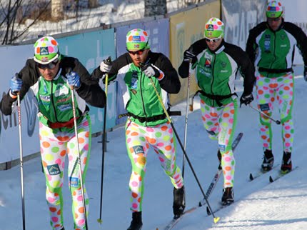The boys of Trondheim (check out powerdudes.com) made quite an appearance at Vasaloppet. Good thing former world sprint champ Johan Kjolstad showed he had the long distance lungs, finishing just 2 seconds behind Mr. Brink for the title, cash and car. When you wear a suit as ugly as this, you better bring yer a-game on raceday.