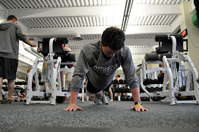 Warming up on the bikes with the snowboard crew.