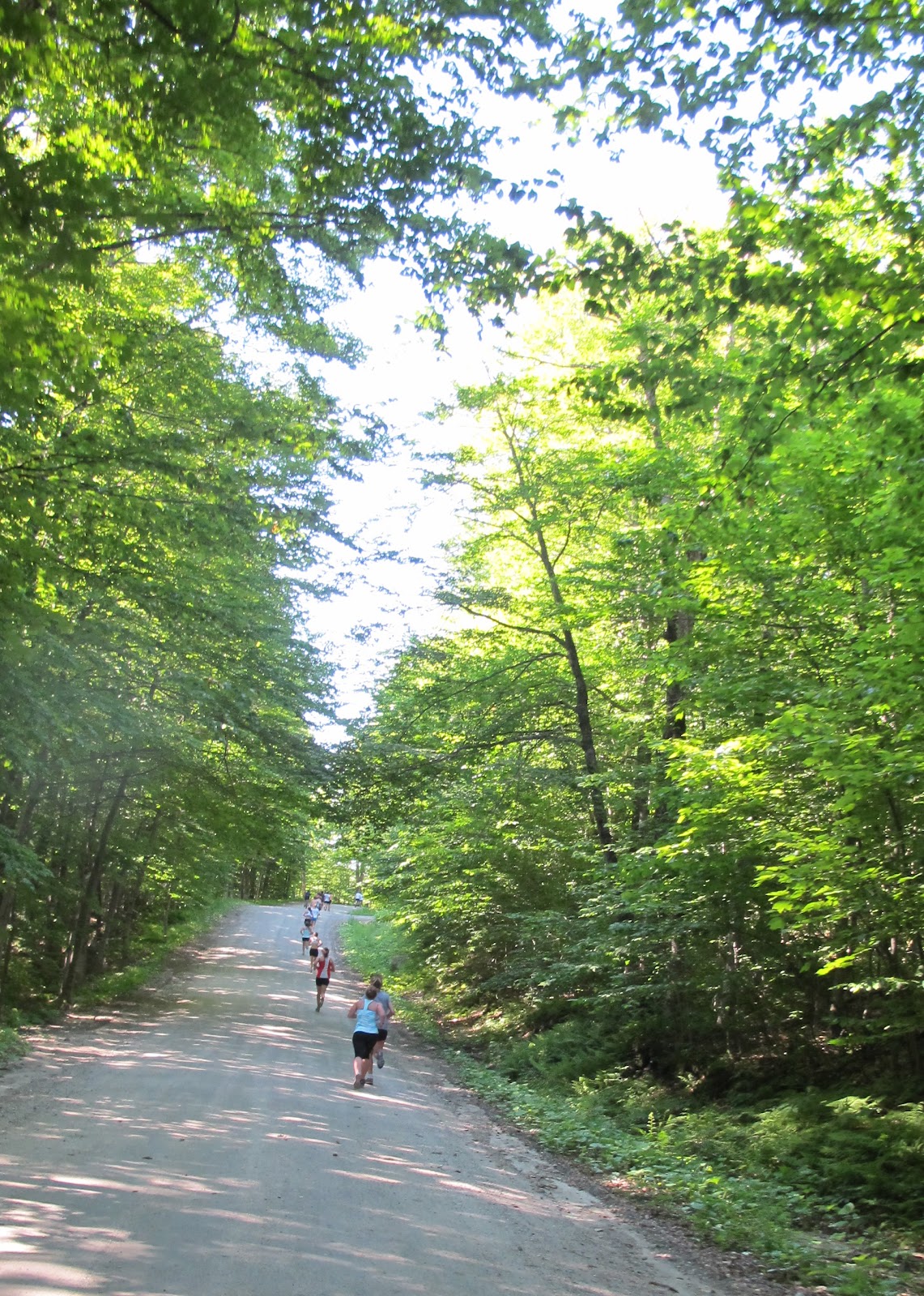 The first mile goes up a pretty good pitch on a dirt road. The second mile is easier and on pavement.
