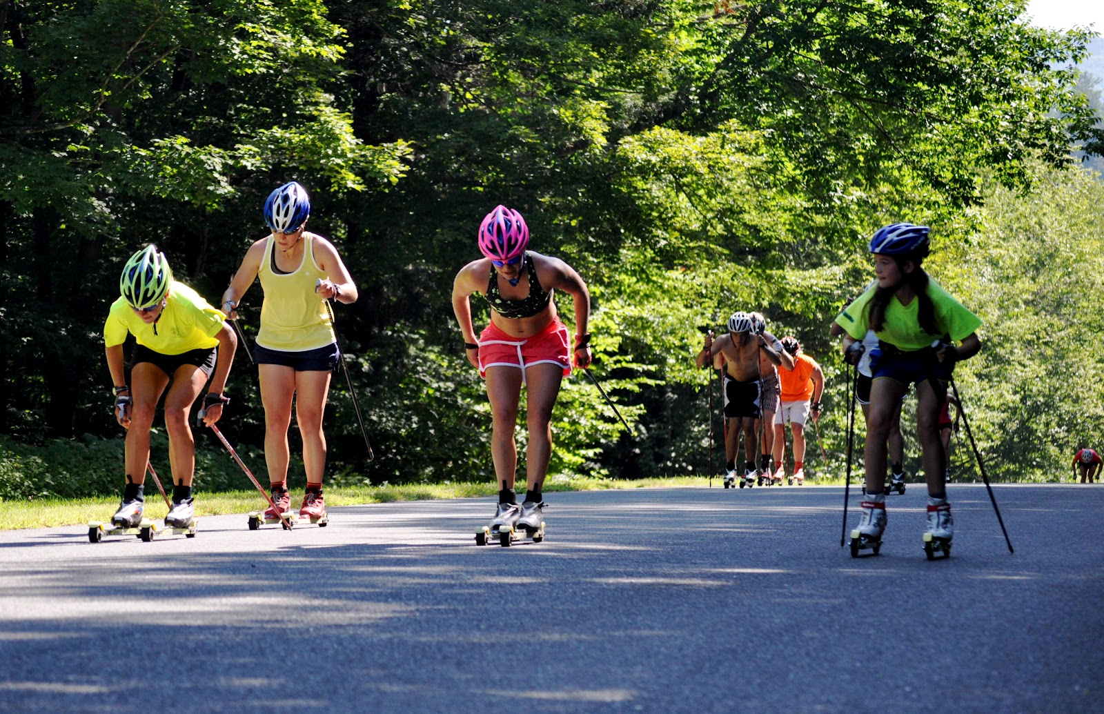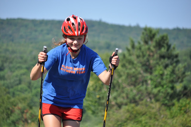The SMS T2 Team women & several of the collegiate skiers warm up together. Welcome to Jessie (in red shorts) who arrived in Vermont yesterday afternoon!