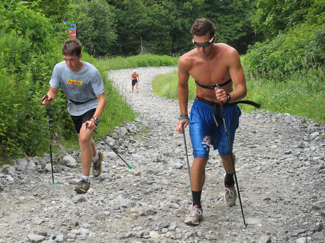 The goal was for the faster ski walkers to jog down below the slower ones and then pass through on each interval. It worked perfectly and everyone got good exposure to the top dogs.