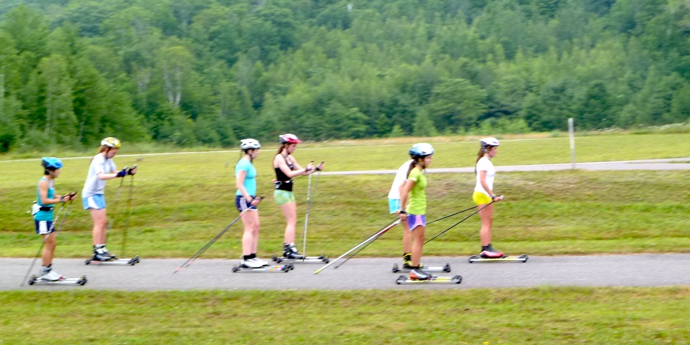On Mondays we train at the Ethan Allen training site – home of the Vermont National Guard and many other military groups. The benefits of this venue include paved rollerski trails with zero traffic. Once in a while, there are other benefits – such as a National Team Camp for the biathletes. While we didn’t work with them directly, just being in the presence of the best in the world generates its own buzz! The biathletes — including several current and former Olympians — were working on shooting. But at one point, I caught most of them distracted by our rollerskiers! Maybe they saw some potential??