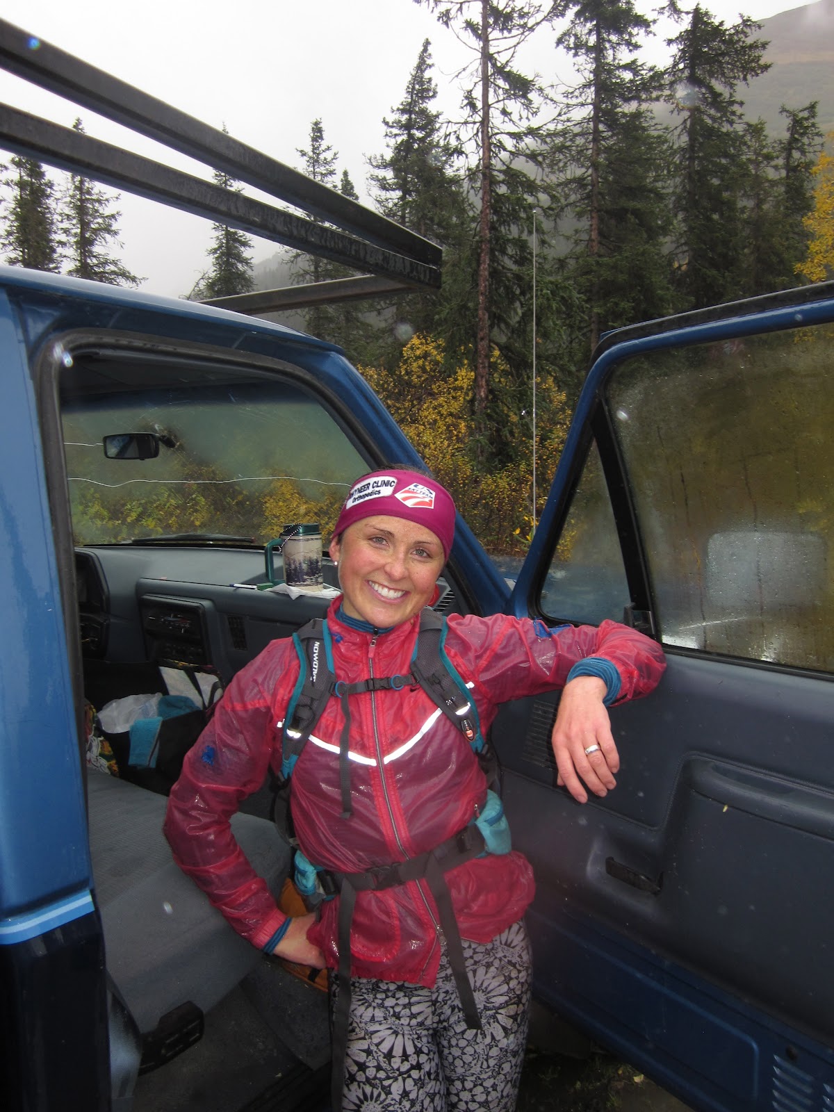 Saturday my training schedule called for a 3 hour OD (over distance) run. Rob, our friend Max & I ran on the Johnson Pass trail, just the other side of Turnagain Pass. Now, Max is from Aspen and he is up spending a few extra days in AK after the International Snow Safety Conference. Max & Rob had visions of “some epic trips” but instead, he came for the worst weather in recent history. Our three hour slog turned out to be possibly the wettest run I’ve ever had in my entire life and Max thought that he ran in more water that day alone than the rest of his life combined! The puddles were literally up to our knees and frequent. And no, the camera did NOT come along for fear that it would be ruined. Here are a couple shots from the parking lot afterwards.