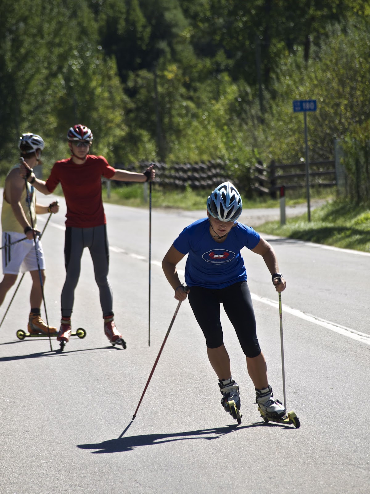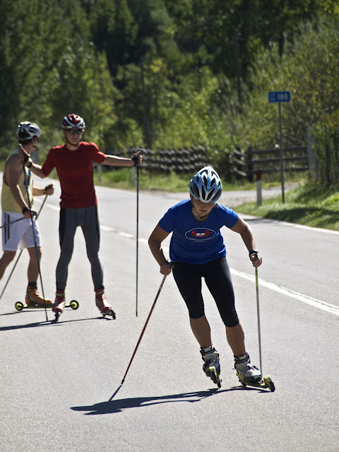 The next day we drove down the valley to work on skate technique and drills on some flatter terrain. We finished the workout with a bunch of sprint starts, working up from 80% to 100% by the end. We saw a group of 50 kids under the age of ten on roller skis, who were taking a Saturday morning cruise on the bike path with the Prad Junior Ski Club.