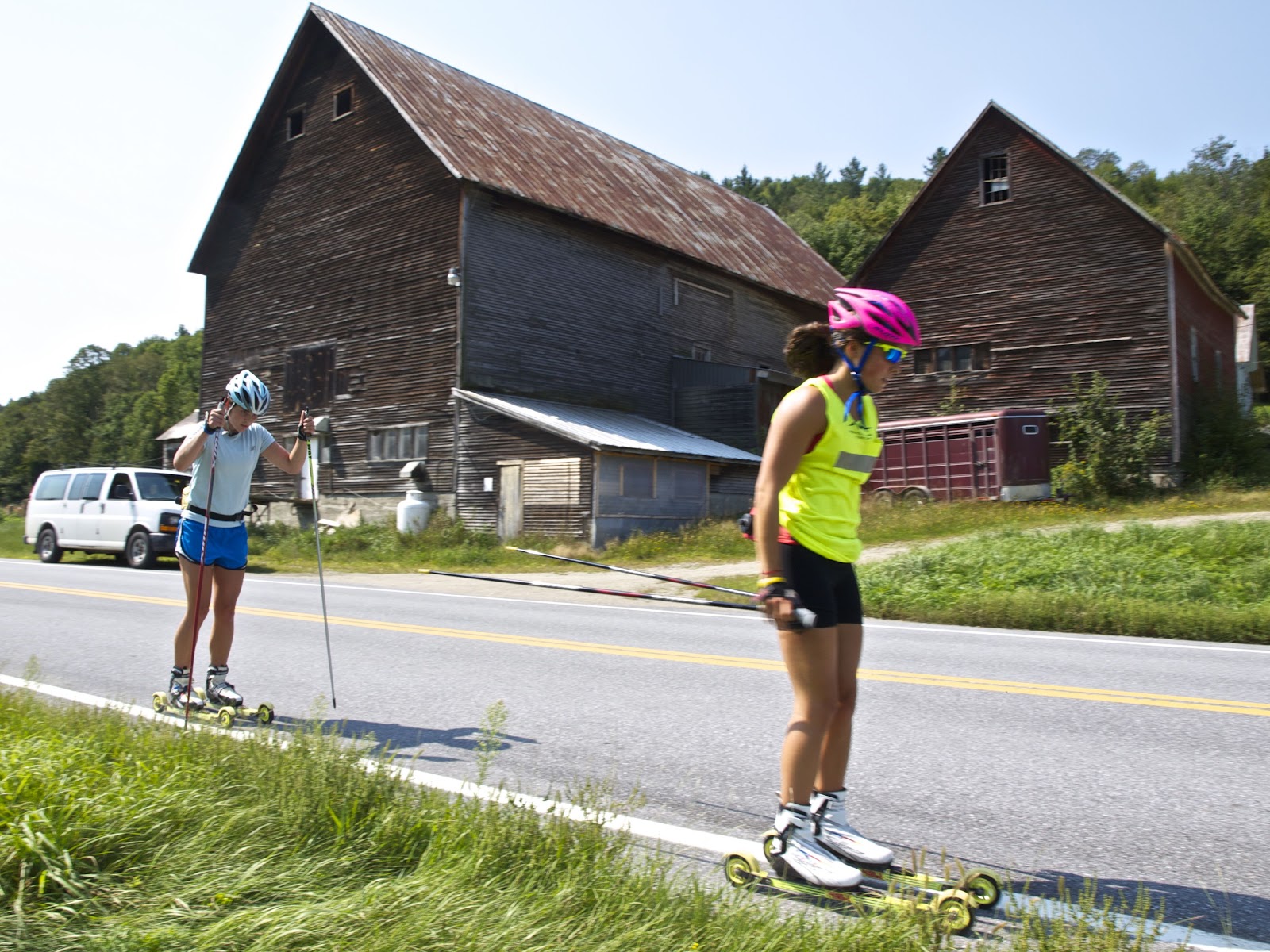 | Heidi and Maddy double pole past another barn. |