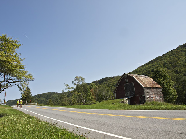 | Sinner leads Dev and Ian past a barn on Rt. 100. |