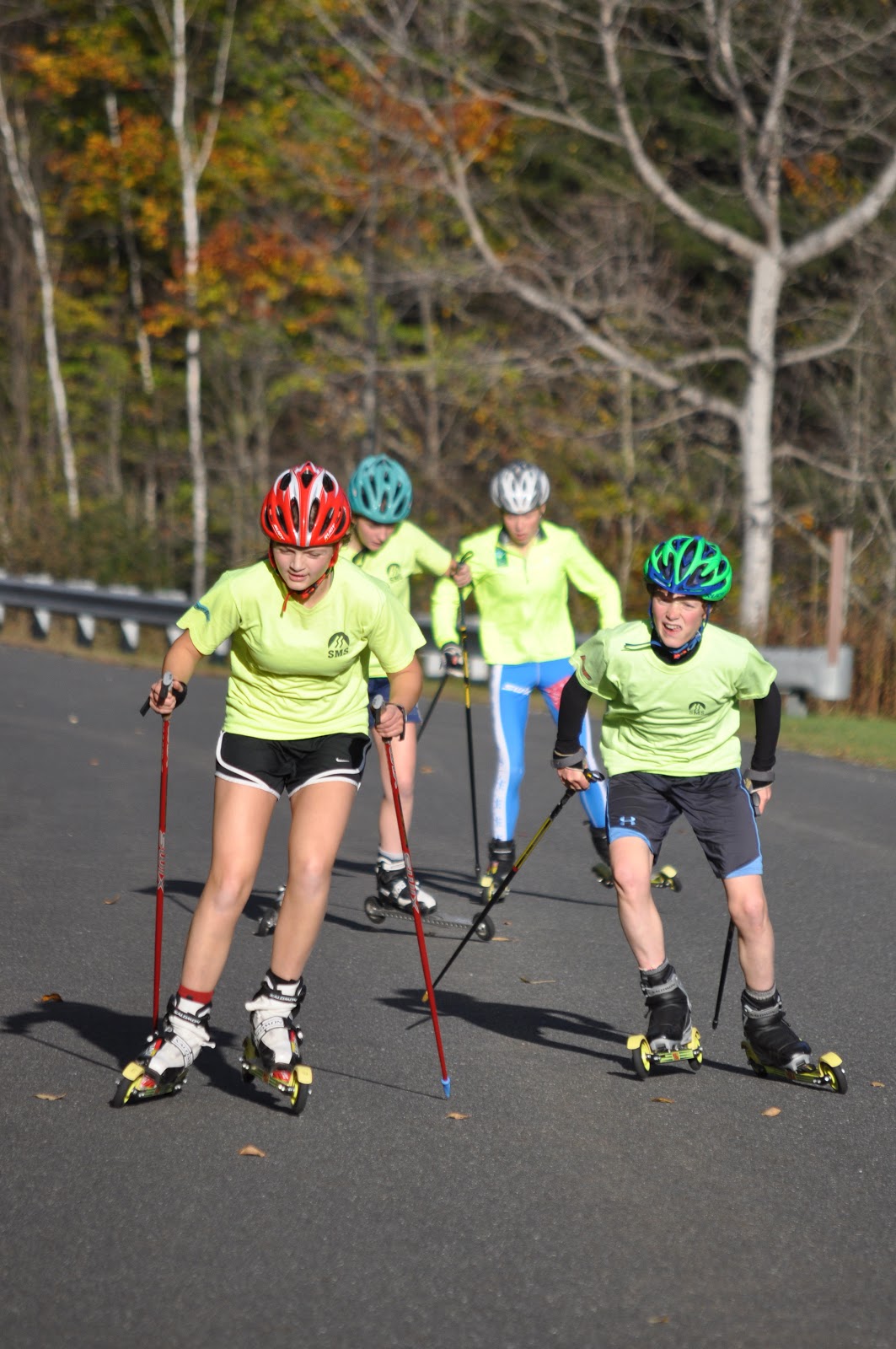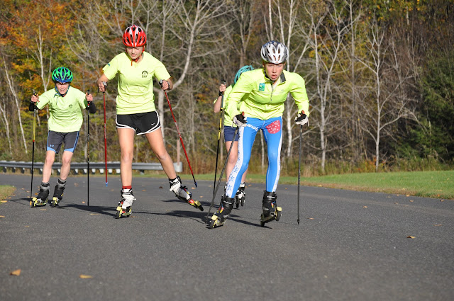 This afternoon Scott and the girls headed over to BMD for a skate distance ski, while the older boys skied from school and did a similar workout. The BMD crew warmed up with some no pole skiing for 15 minutes and then did a few technique drills, including trying to ski in a synchonized pack (varying levels of success!). The bulk of the ski was spent skiing back and forth over an up and down section of terrain and doing a pick up into and out of the “dip”. 15 minute cool down ski and back up to school! Tomorrow is the first day of Parent’s Weekend so we have no classes, but we will have two workouts – double pole test at 10am and the obstacle course relay with the whole school at 2:30pm! Stay tuned for lots more photos from the weekend!