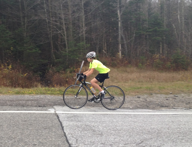 A few relevant notes when looking at times: (1) Gino’s ratchet came loose on the ski so he stopped halfway through the ski and ran the rest of his way. His ski time is a combo of running, skiing, and stopping to work on his ski. (2) Scott lost a pole tip on the ski. (3) Mollie’s calves started bugging her on the run. She also did not do the bike, so her total time is ski + run. (4) Hamish’s back started bugging him after the bike. Everyone else was healthy and good to go as far as we’re aware! 🙂 Regardless of equipment or body malfunctions, it was an awesome event and definitely a tough morning. Congrats to everyone for finishing! Not a lot of pictures – coaches were timing & shuttling gear in the van. Russell on the bike – he elected to start ahead of the guys and ease into the workout.