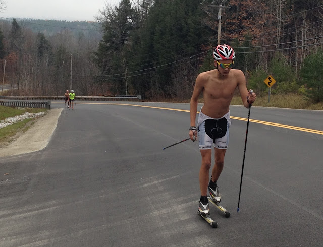 Today we biked, skied, and ran up into the clouds for the Vertical Challenge. Starting from the Manchester P.O. we biked up to the Winhall Library (12.25 miles), then switched to classic rollerskis and skied up the Access Road (4.75 miles), then switched to running shoes and ran up Stratton (2.3 miles). Starting elevation – 720 feet. Finish elevation – 3880 feet. Maps & results below. Formatting is funky on the spreadsheet below, but all times are in total minutes, except for the finish times which are H:MM:SS. If you catch a mistake, let me know.