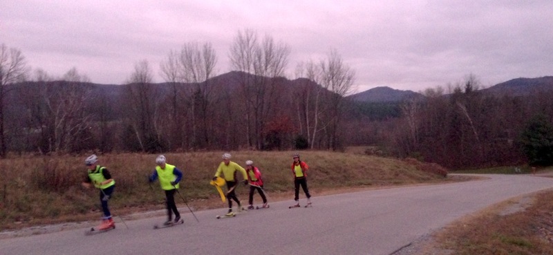 This past week we had a focus on volume and continuous skiing at low- to moderate-intensity. In spite of the shortened days and the venue changes, we were able to get some quality workouts. Thanks to good attitudes from the athletes and help from several parents, we stayed safe and had fun to boot. The banner picture above shows us near the end of training last Tuesday (11/6 at 5:30pm). That is what a group of 15 hard-core rollerskiers looks like! Thank you to the following parents for helping with “chaperoning” the end of our training sessions when it has been pitch black: